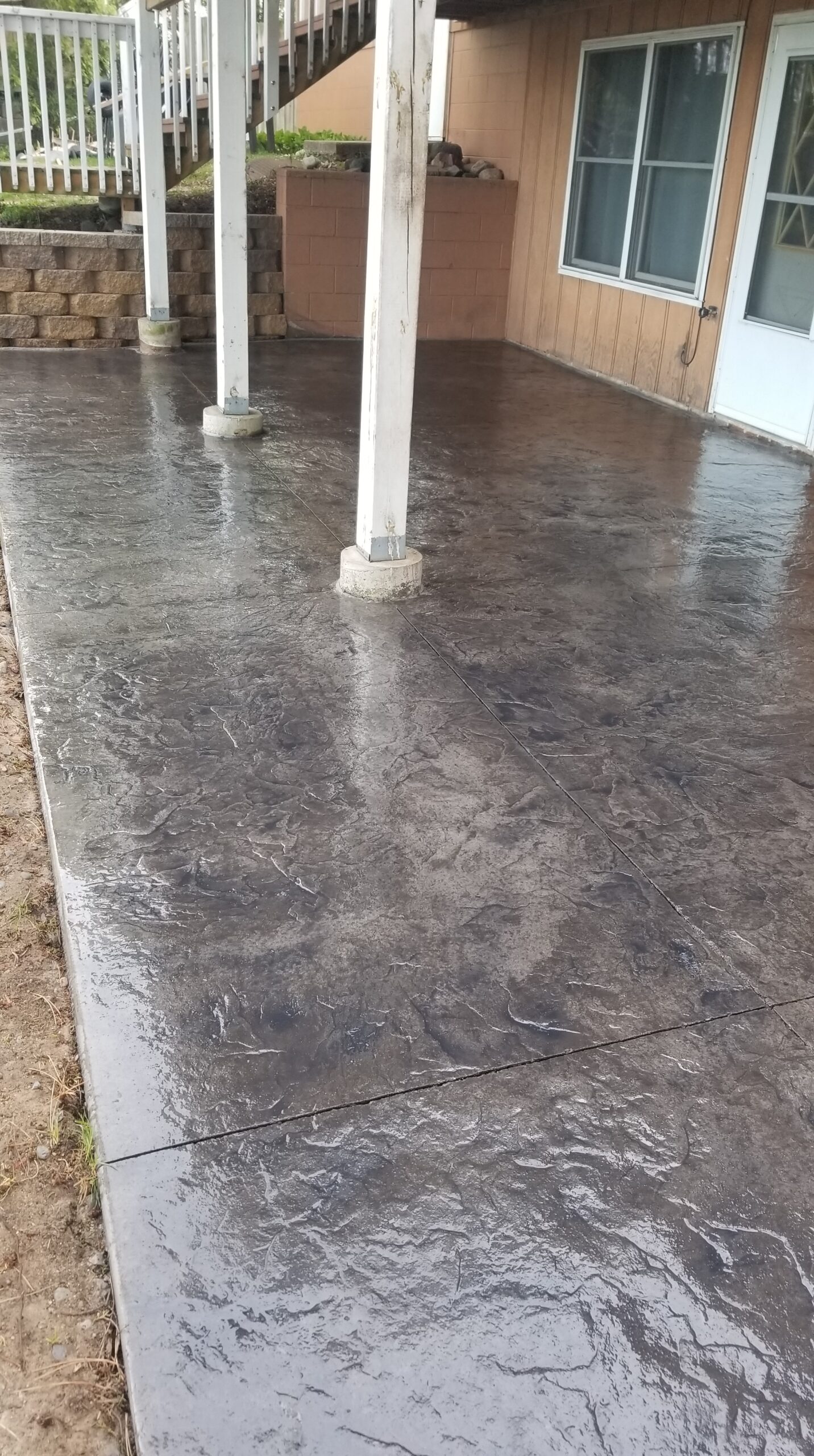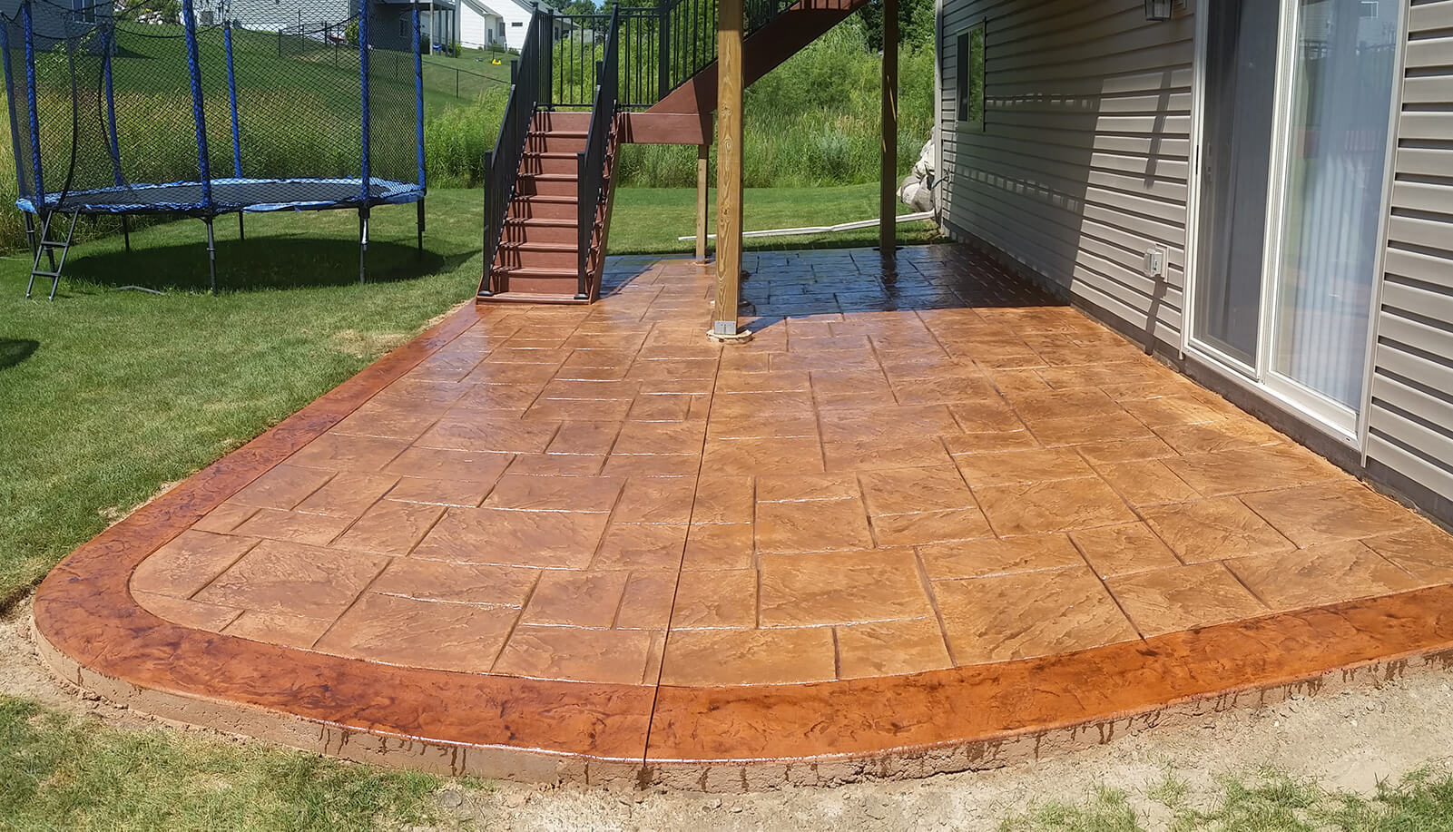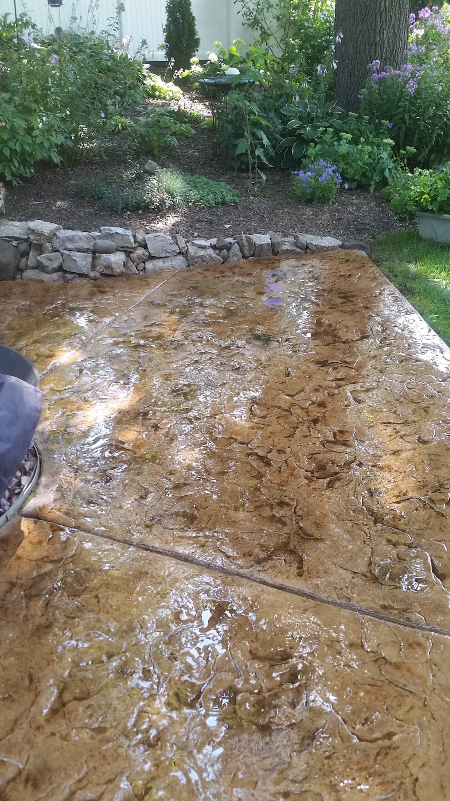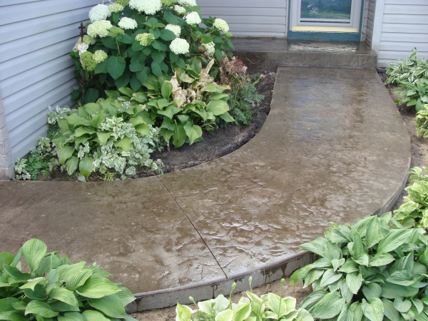 Stamped Concrete Sidewalk in BackyardDecorative concrete is a beautiful yet durable option to pouring concrete for patios, sidewalks, driveways, and concrete countertops. Stamped concrete has come along way with numerous stamp patterns to choose from. Just as there is many different stamp patterns, there are many colors for coloring concrete as well, and antiquing colors that add that realistic final touch. With stamped patios what is included in the price is the usual things that are required for pouring concrete as well as color for concrete, antiquing color, saw cutting relief joints, pressure washing slab, and first coat of sealer. The sealer is to protect the concrete as well as to beatify it giving the stamped concrete a “wet look“.