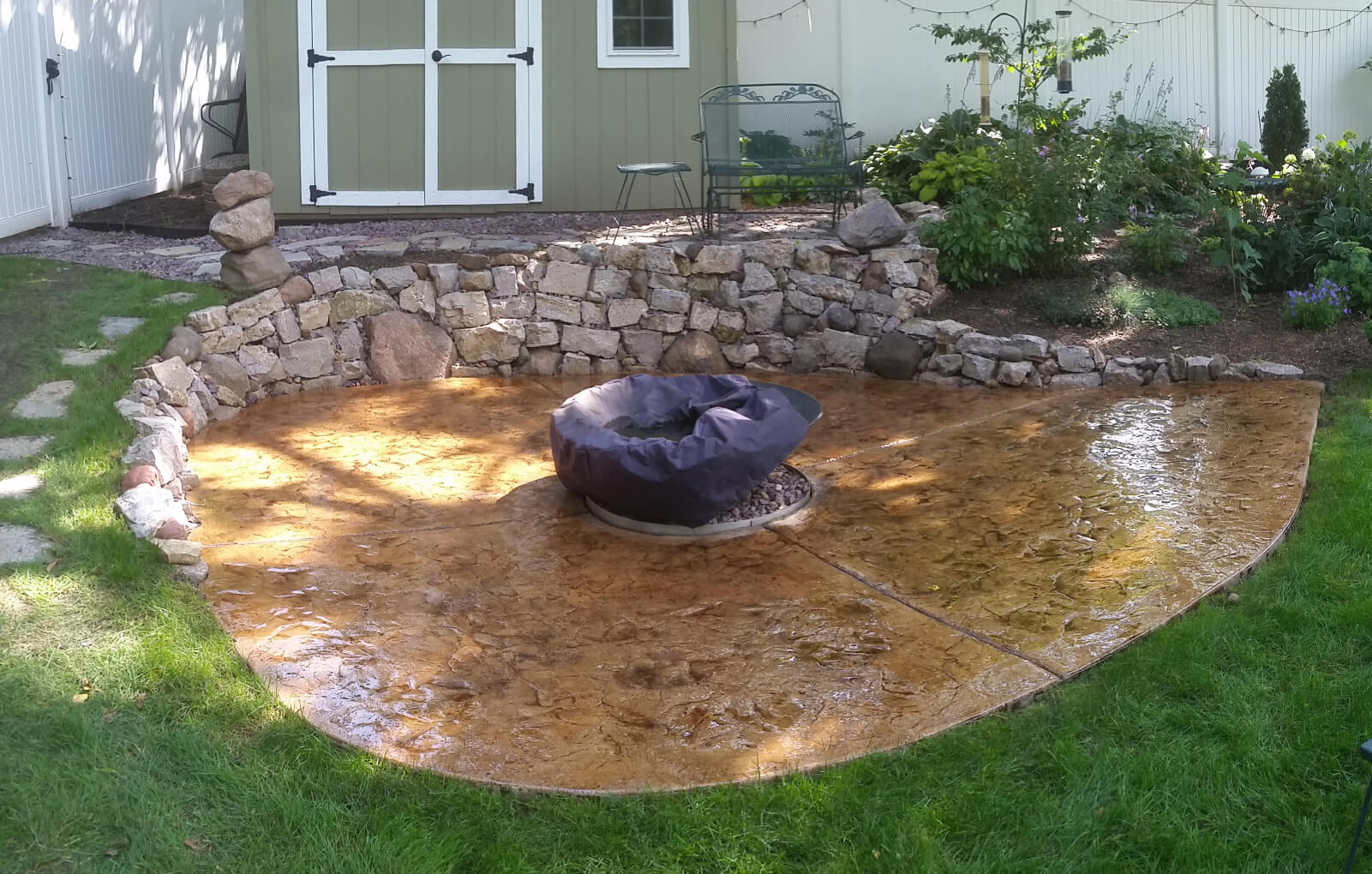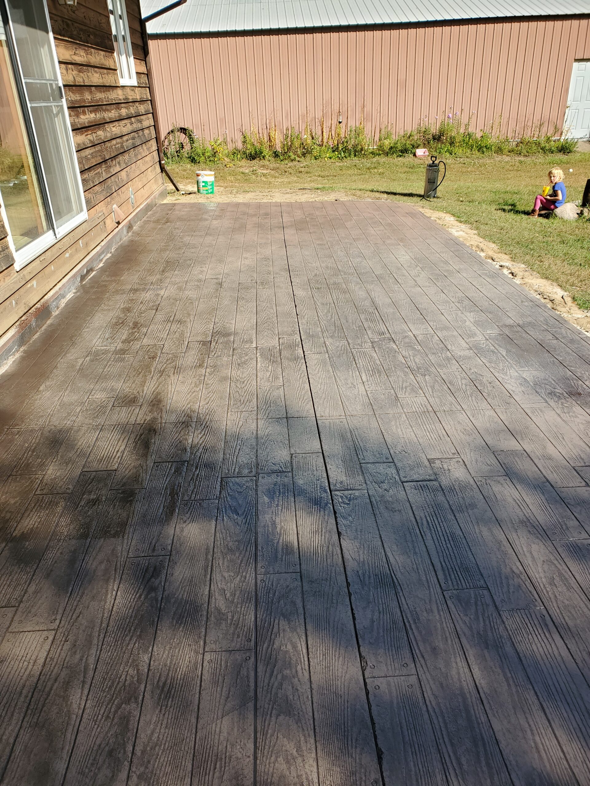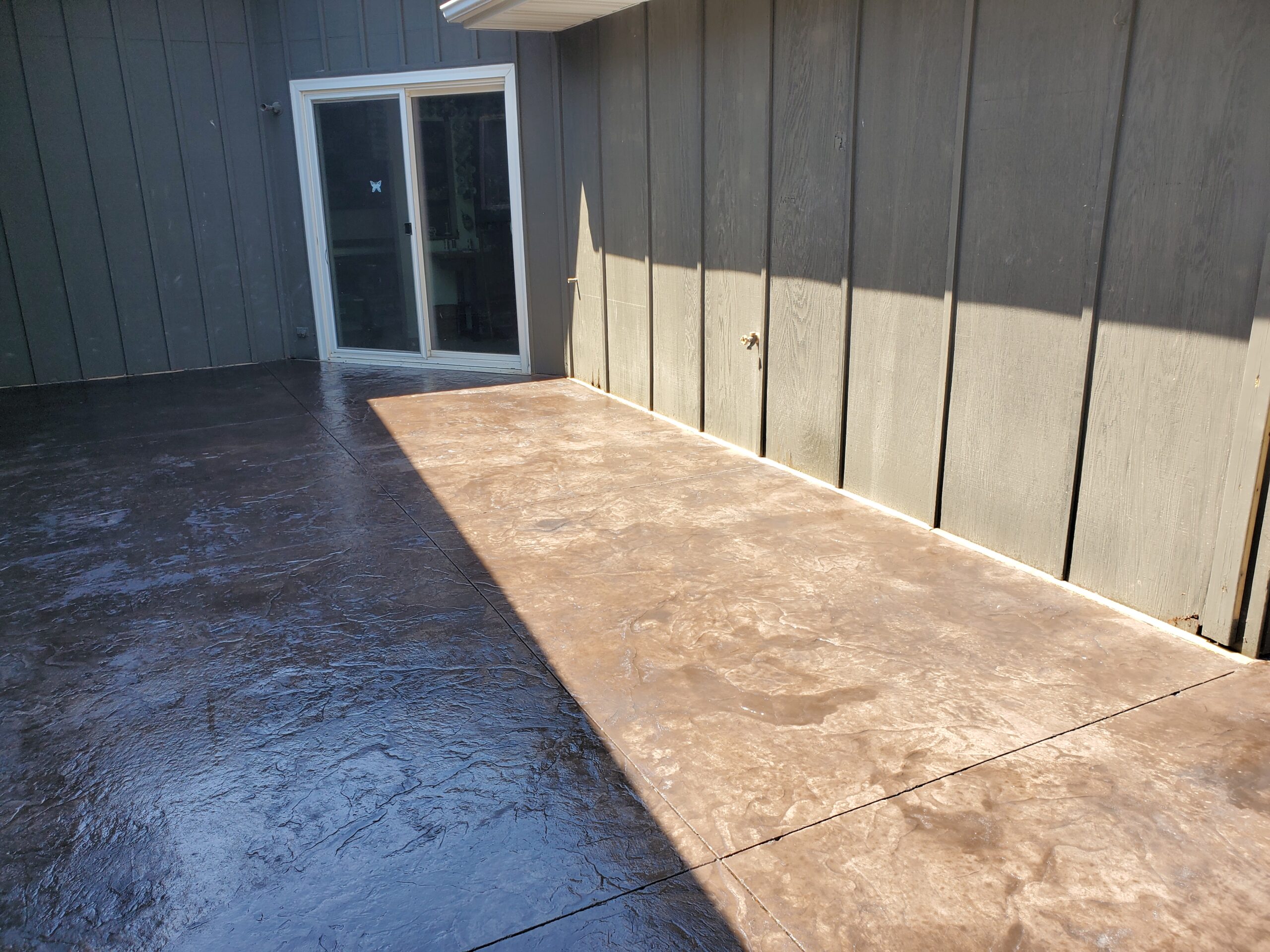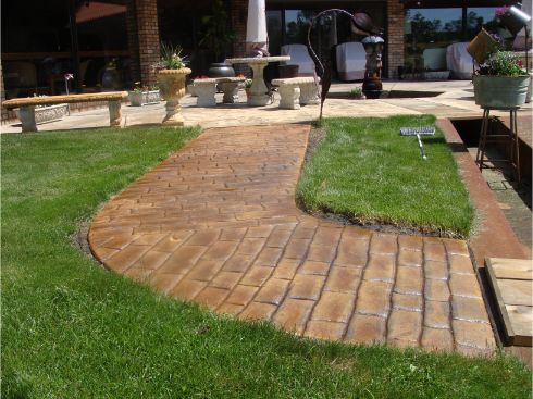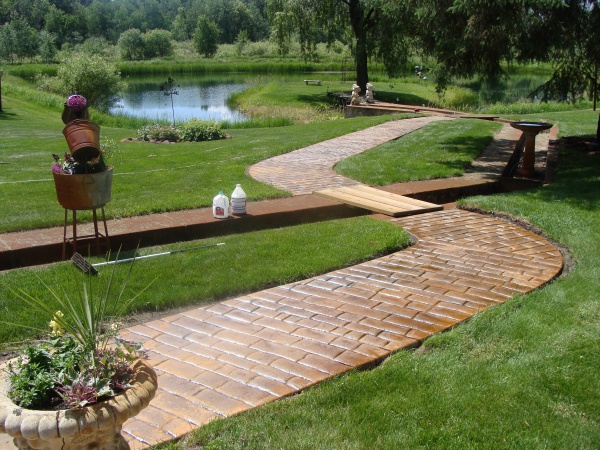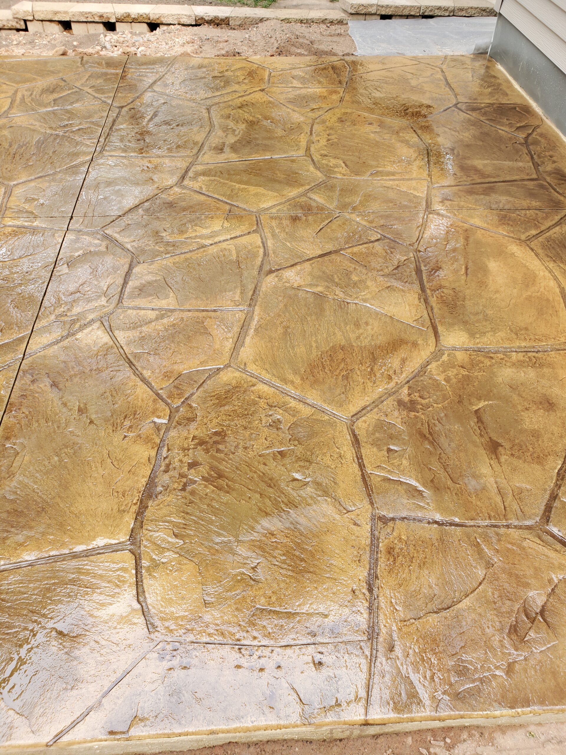 Stamped Concrete Sidewalk in BackyardDecorative concrete is a beautiful yet durable option to pouring concrete for patios, sidewalks, driveways, and concrete countertops. Stamped concrete has come along way with numerous stamp patterns to choose from. Just as there is many different stamp patterns, there are many colors for coloring concrete as well, and antiquing colors that add that realistic final touch. With stamped patios what is included in the price is the usual things that are required for pouring concrete as well as color for concrete, antiquing color, saw cutting relief joints, pressure washing slab, and first coat of sealer. The sealer is to protect the concrete as well as to beatify it giving the stamped concrete a “wet look“.